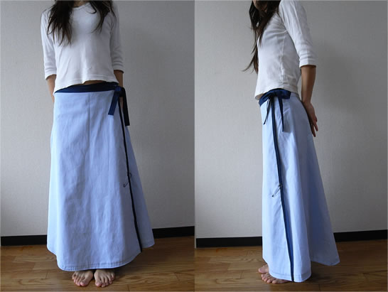 巻きスカートを作りました。めくれて見える裏の部分は別の生地にしました。巻きスカートの生地が余ったので...