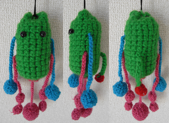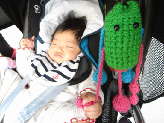手でイロイロ掴めるようになってきたので、吊り下げられるガラガラを作りました。名前はちょろんぼ。カラン...