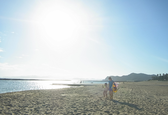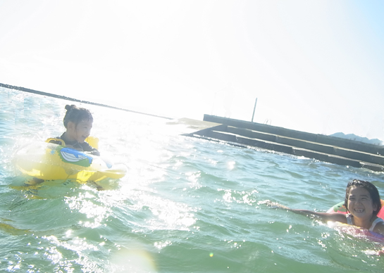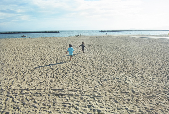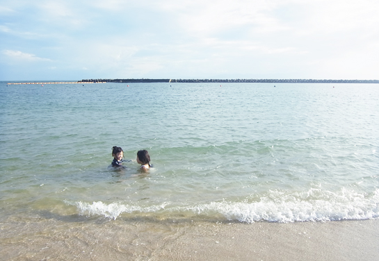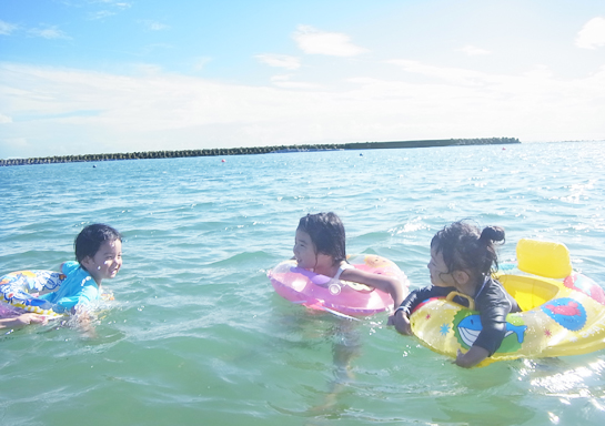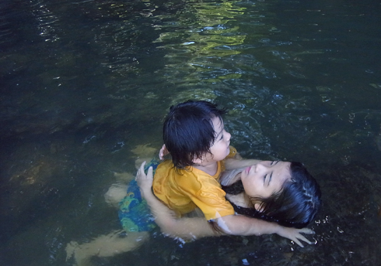 今回の旅のメインとも言える、海水浴!この2人は当然の笑顔。常に遠くへ行こうと試みる2人。浮き輪初挑戦...